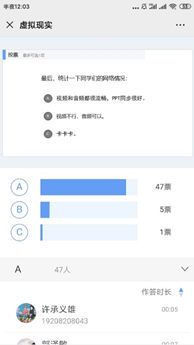 在线教学已经进行了五周,马老师的《虚拟现实技术》和《数据可视化》课程的课堂气氛活跃,同学们连麦发言讨论积极,答题交互参与率93%以上,聊天区的文字互动活跃,章节单元测试成绩约90%以上。