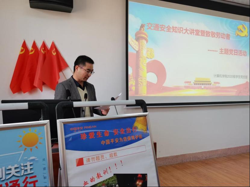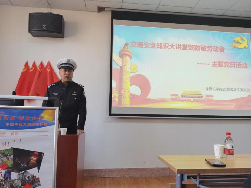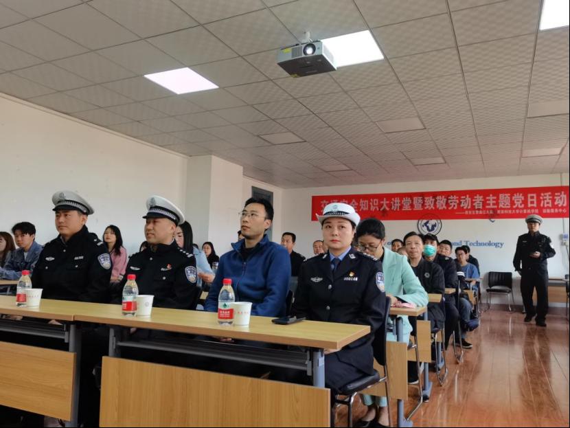4月29日上午,计算机公司与后勤处联合举办的交通安全知识大讲堂暨致敬劳动者主题党日活动,在临潼骊山校园在计算机公司512学术报告厅举行。西安交警曲江大队副队长谢勇涛、曲江大队西影路中队副队长崔浩哲、民警何莺歌、王斌,FUN88乐天使后勤处副处长孙涛、后勤处运输服务中心、计算机公司师生党员和入党积极分子代表60余人参加此次活动。