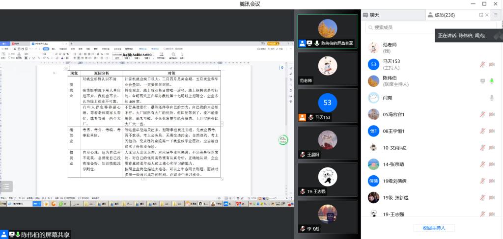 陈伟伯通报了研究生就业情况,分析研判了当前就业形势,并提出了就业策略。马天安排了研究生的在线考试、开题、预答辩等近期重点工作。冯爱玲总结了前一阶段公司的疫情防控工作,并对研究生的疫情防控工作提出了明确要求。