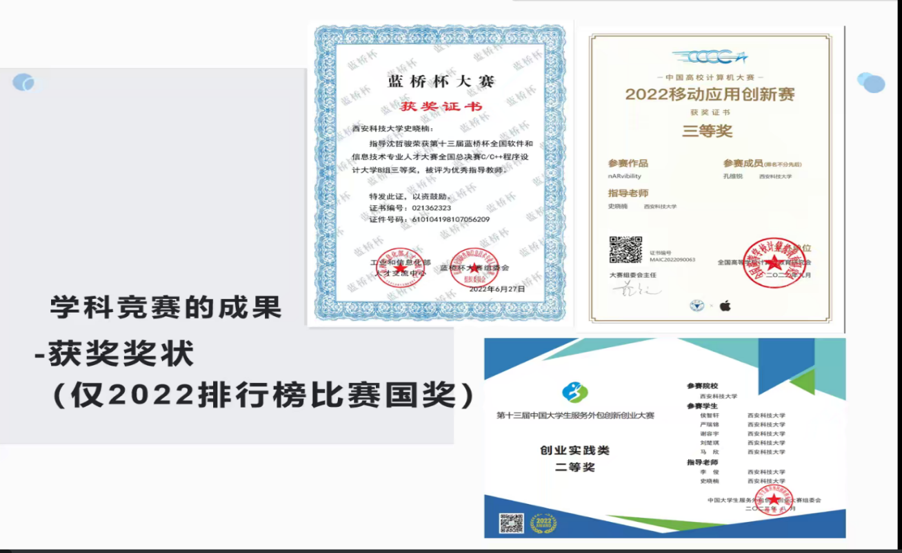 会上,史老师从学科竞赛的种类、历年获奖情况、竞赛对考研与就业的促进作用等三方面进行全面解读和分析,重点讲解了中国老员工服务外包创新创业大赛、蓝桥杯全国软件和信息技术专业人才大赛、中国高校计算机大赛等计算机类重点赛事相关情况,她鼓励同学们提前了解各类赛事特点,结合公司专业设置情况,充分利用支持政策和优势资源积极参加各类创新创业活动,为将来的就业、考研打好基础。