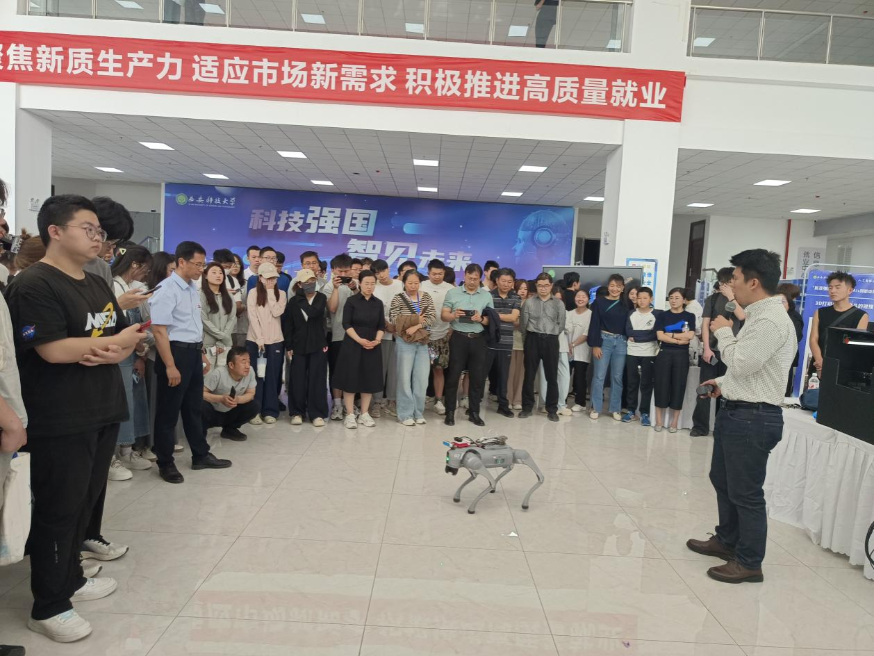 曾亮相体育节和工作会议的“网红”机器狗,此次展示了坐、卧、行走等指令。配备热像仪、激光雷达等传感器,可应用于高危环境智能巡检。侯锐志老师表示:“已实现从感知到认知的跃迁,为安全巡检提供创新解决方案。”