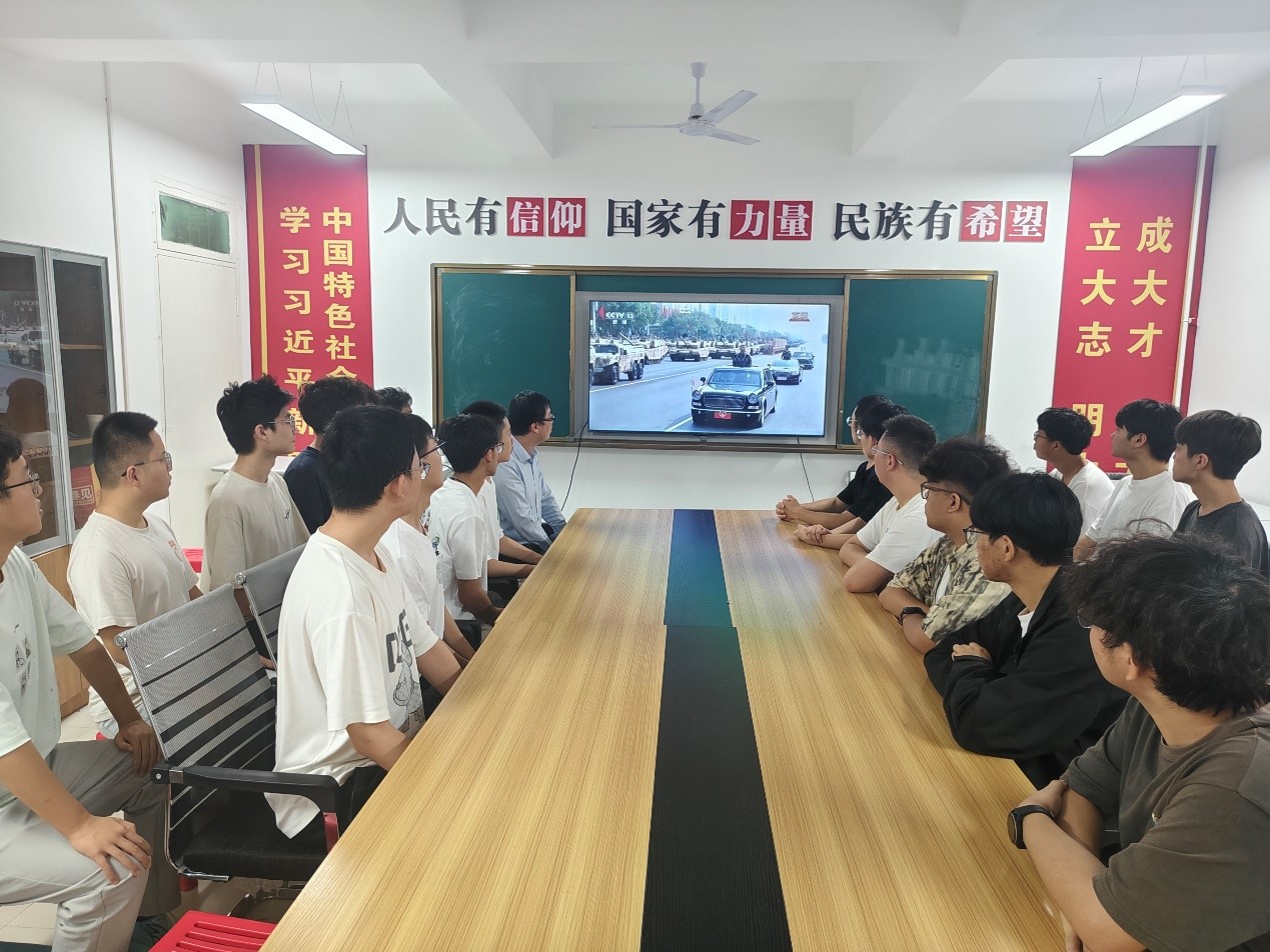 在党旗、国旗、军旗引领下,受阅方阵踏着铿锵步伐经过天安门,45个方(梯)队依次亮相,陆海空基战略重器、高超精打、无人和反无人装备彰显着现代化军队的威武气势。一幕幕震撼人心的画面,让在场师生深刻感受到国家的强大实力与民族的不屈精神,也更加深切体会到革命先烈为国家独立、民族解放作出的巨大牺牲。