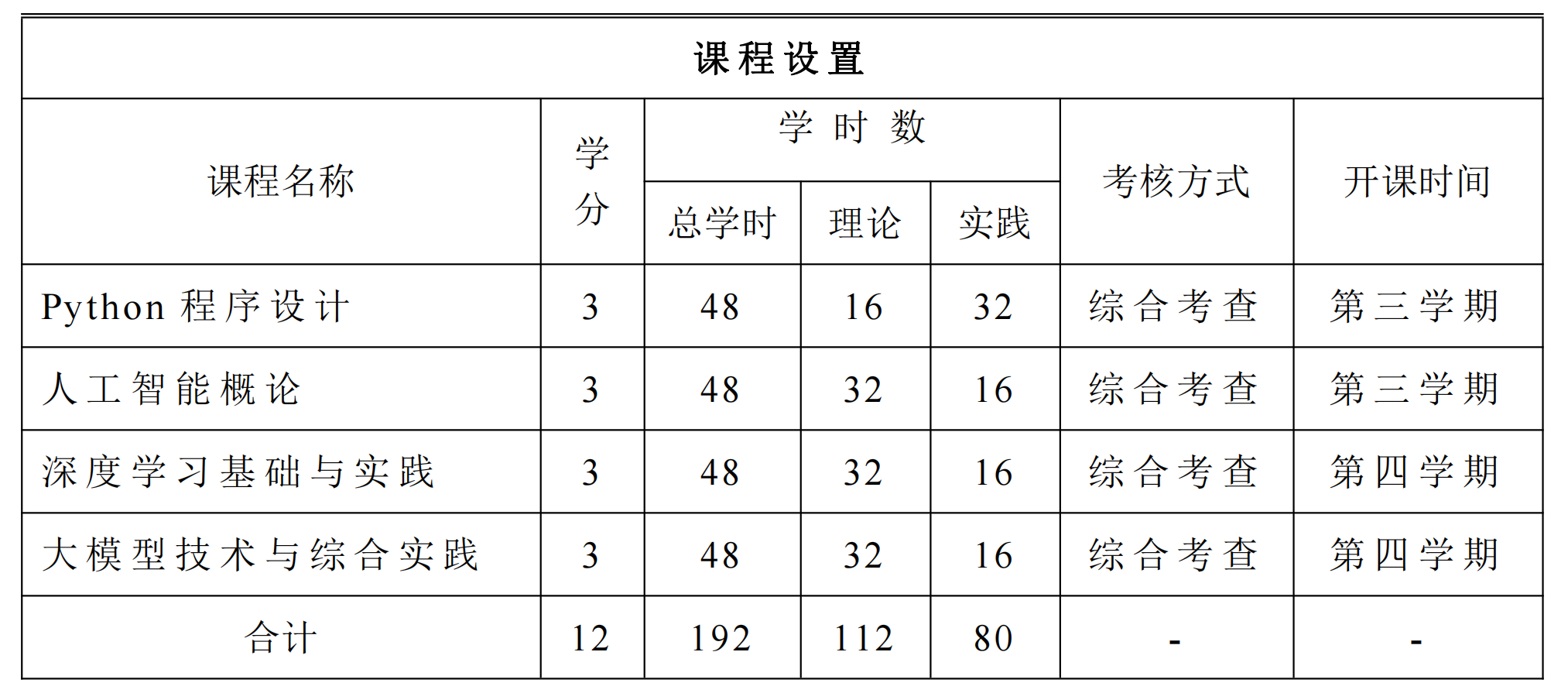 大模型技术与应用微专业以“技术引领、应用驱动”为核心理念,打造多元公司产品模式,构建个性人才工程实践教学体系,培养具有跨界思维、创新意识和自主学习能力的复合型人才,为员工多元发展与个性需求提供广阔空间。计划开设4门课程,包括Python程序设计、人工智能概论、深度学习基础与实践和大模型技术与综合实践,每门课分理论和实践两个环节。
