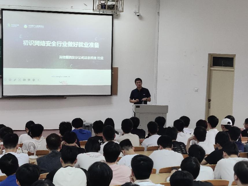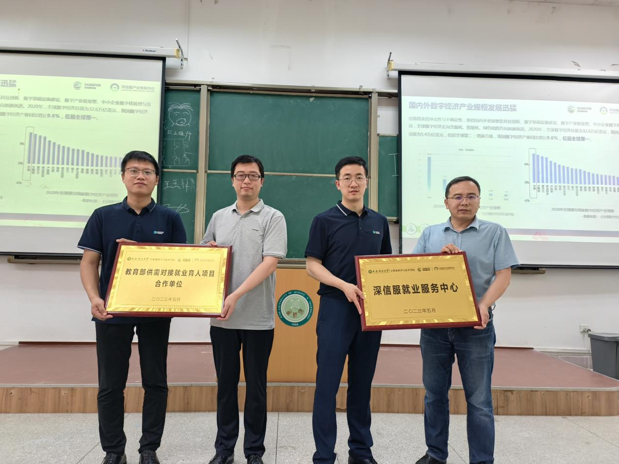 活动开始,杜斌以《初识网络安全行业做好就业准备》为题,详细介绍了深信服公司的文化、业务以及未来的发展方向,并以网络安全为重点,对标企业需求,详细讲解了同学们需要掌握的知识技能和面试技巧,为下一步的学习和实践提供了明确指导。随后,深信服公司与计算机公司进行了“深信服就业服务中心”和“教育部供需对接就业育人项目合作单位”授牌仪式。