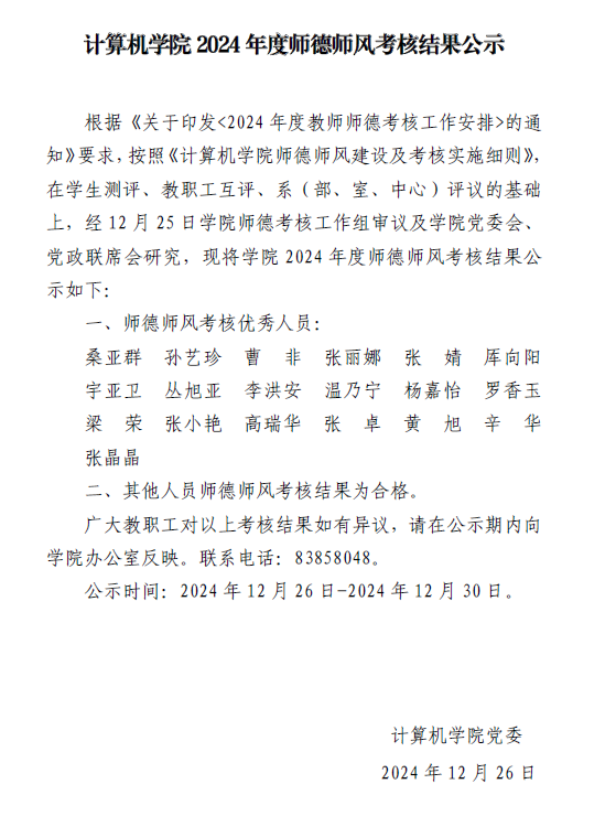 计算机公司2024年度师德师风考核结果公示